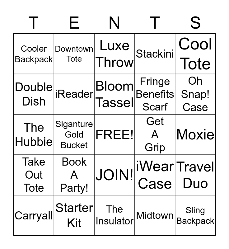 This bingo card has a free space and 24 words: Book A Party!, Starter Kit, Bloom Tassel, Carryall, Cool Tote, Cooler Backpack, Double Dish, Downtown Tote, Get A Grip, JOIN!, Fringe Benefits Scarf, The Hubbie, iWear Case, Travel Duo, iReader, Midtown, Moxie, Luxe Throw, Oh Snap! Case, Siganture Gold Bucket, Sling Backpack, Take Out Tote, Stackini and The Insulator.