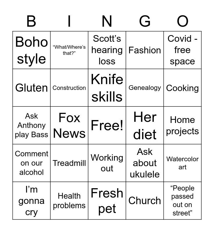 This bingo card has a free space and 25 words: Treadmill, Fresh pet, Knife skills, I’m gonna cry, Covid - free space, Boho style, Gluten, “What/Where’s that?”, Her diet, Working out, Genealogy, Ask Anthony play Bass, Ask about ukulele, Watercolor art, Construction, Overapologizing, Home projects, Scott’s hearing loss, Cooking, Fox News, “People passed out on street”, Health problems, Comment on our alcohol, Fashion and Church.