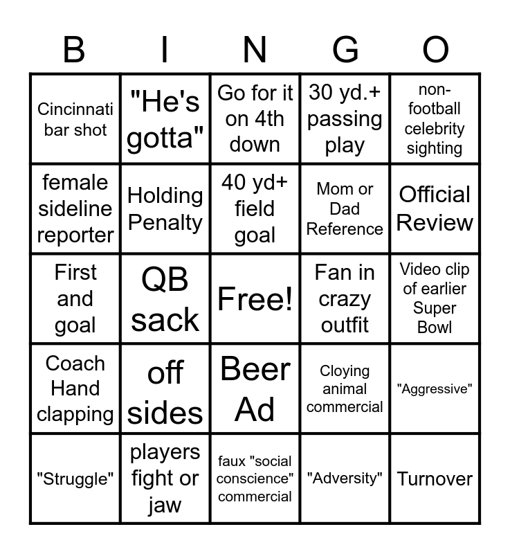 This bingo card has a free space and 24 words: off sides, players fight or jaw, 40 yd+ field goal, "Struggle", non-football celebrity sighting, Cincinnati bar shot, female sideline reporter, "He's gotta", Fan in crazy outfit, Beer Ad, Mom or Dad Reference, First and goal, Cloying animal commercial, "Aggressive", Holding Penalty, "Adversity", Video clip of earlier Super Bowl, Go for it on 4th down, Official Review, QB sack, Turnover, Coach Hand clapping, 30 yd.+ passing play and faux "social conscience" commercial.
