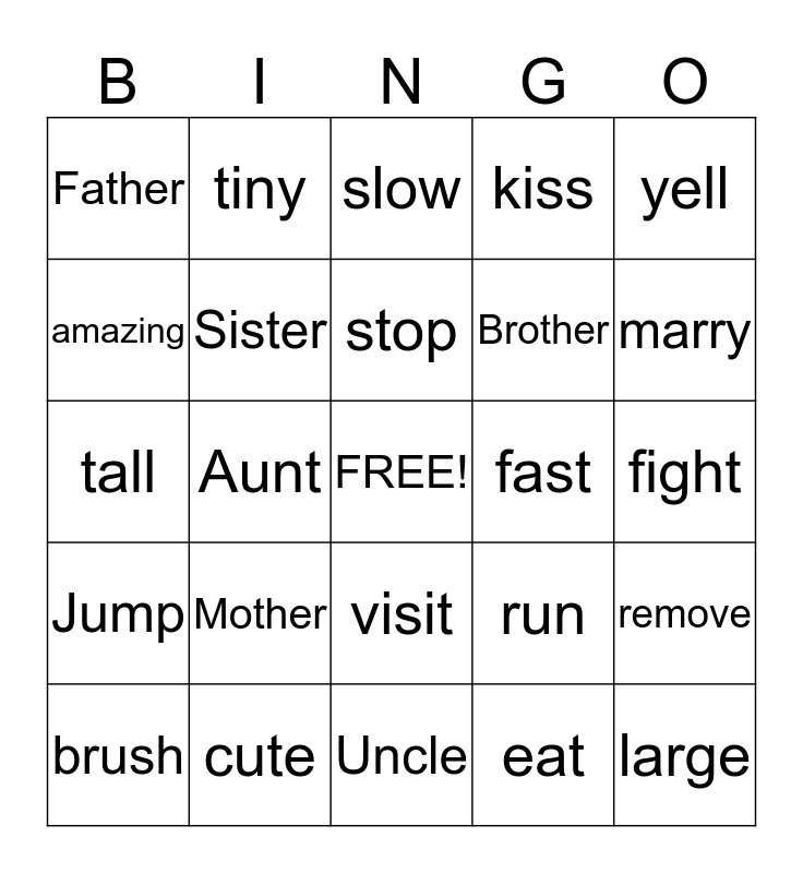This bingo card has a free space and 24 words: Mother, cute, stop, brush, yell, Father, amazing, tiny, fast, visit, Brother, tall, run, remove, Sister, eat, fight, slow, marry, Aunt, large, Jump, kiss and Uncle.