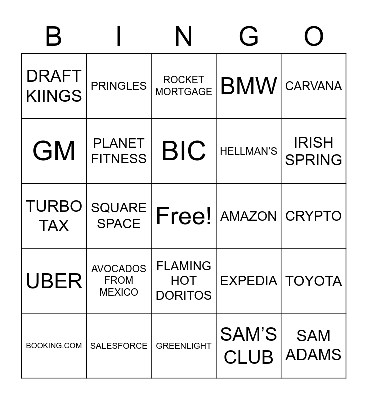 This bingo card has a free space and 39 words: BUDWEISER CLYDESDALES, BUD LIGHT SELTZZER HARD SODA, LAYS POTATO CHIPS, PLANET FITNESS, BOOKING.COM, FLAMING HOT DORITOS, BIC, PEPSI, CARVANA, UBER, SQUARE SPACE, BMW, SAM ADAMS, CRYPTO, AMAZON, AVOCADOS FROM MEXICO, BUD LIGHT, DRAFT KIINGS, ETRADE, EXPEDIA, GM, GREENLIGHT, HELLMAN’S, IRISH SPRING, KIA, META, MICHELOB, NISSAN, OIKOS, PRINGLES, QUICKBOOKS, RAKUTEN, ROCKET MORTGAGE, SALESFORCE, SAM’S CLUB, TACO BELL, TOYOTA, TURBO TAX and VROOM.