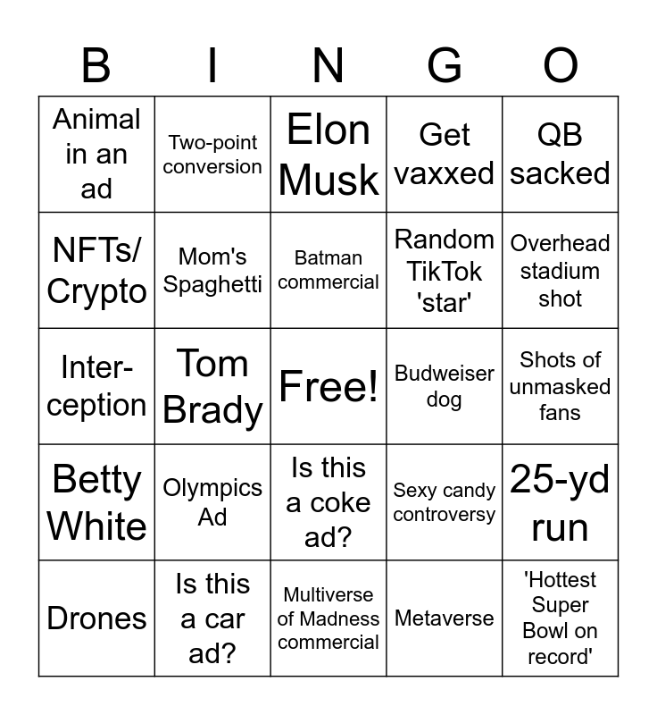 This bingo card has a free space and 39 words: Rams score, Missed field goal, Bengals score, Mom's Spaghetti, Drones, Is this a coke ad?, Batman commercial, Jurassic World commercial, QB sacked, Betty White, Tom Brady, Get vaxxed, 'Hottest Super Bowl on record', Shots of unmasked fans, Budweiser dog, Olympics Ad, Skyline Chili reference, Animal in an ad, Fumble, Sexy candy controversy, NFTs/ Crypto, Multiverse of Madness commercial, Random TikTok 'star', Overhead stadium shot, Pete Davidson, Top Gun Trailer, Zendaya, Downton Abbey, Obi-Wan, Two-point conversion, Heads, Tails, Elon Musk, Is this a car ad?, Metaverse, Draft first pick, 25-yd run, Inter-ception and Call under review.