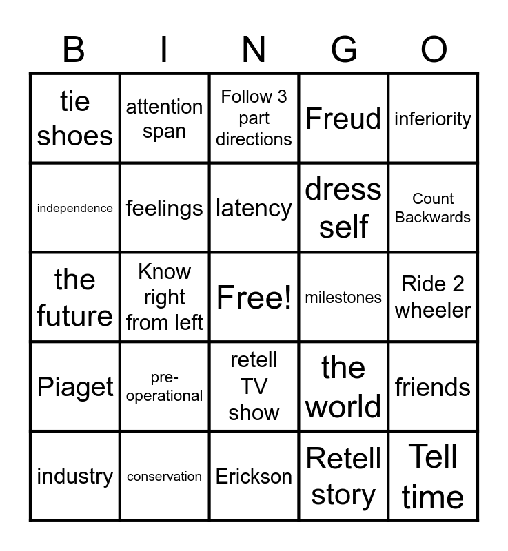 This bingo card has a free space and 24 words: pre-operational, conservation, latency, industry, inferiority, tie shoes, independence, attention span, milestones, retell TV show, dress self, the future, the world, friends, feelings, Retell story, Ride 2 wheeler, Follow 3 part directions, Count Backwards, Know right from left, Tell time, Piaget, Freud and Erickson.