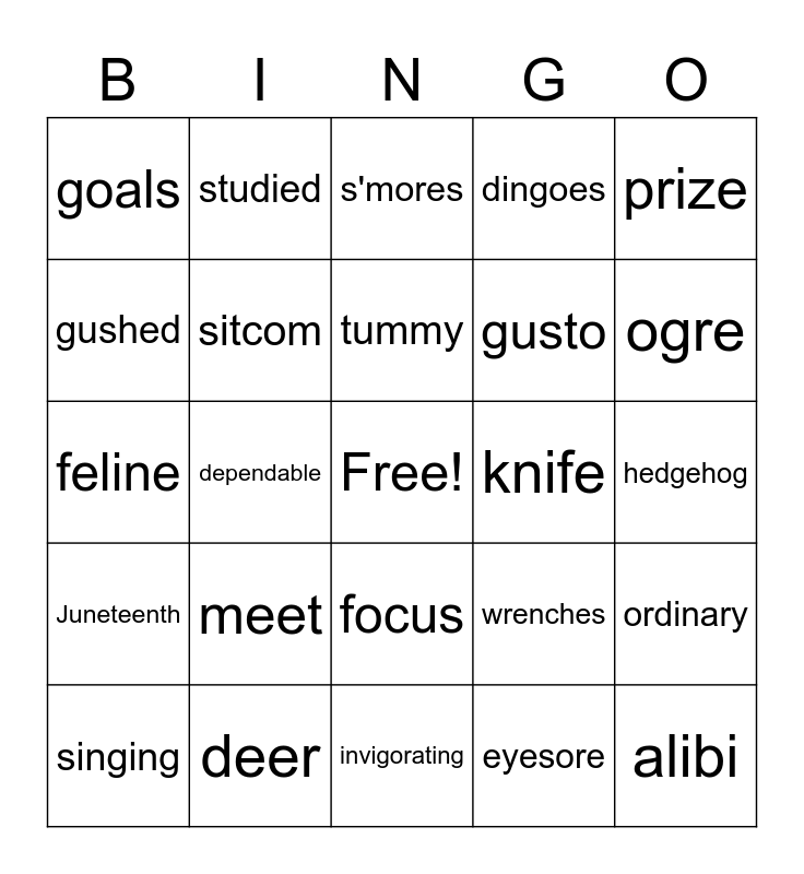 This bingo card has a free space and 24 words: meet, deer, tummy, singing, prize, goals, gushed, studied, knife, focus, gusto, feline, wrenches, ordinary, sitcom, eyesore, hedgehog, s'mores, ogre, dependable, alibi, Juneteenth, dingoes and invigorating.