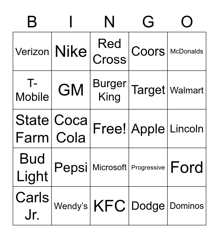 This bingo card has a free space and 24 words: Pepsi, Wendy’s, Burger King, Carls Jr., McDonalds, Verizon, T-Mobile, Nike, Apple, Microsoft, Target, State Farm, Progressive, Ford, GM, Dodge, Lincoln, Red Cross, Walmart, Coca Cola, Dominos, Bud Light, Coors and KFC.