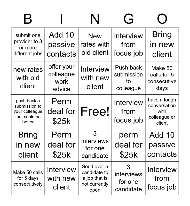 This bingo card has a free space and 24 words: Make 50 calls for 5 days consecutively, Perm deal for $25k, Interview with new client, 3 interviews for one candidate, Bring in new client, submit one provider to 3 or more different jobs, Add 10 passive contacts, New rates with old client, Interview from focus job, have a tough conversation with colleague or client, push back a submission to your colleague that could be better, offer your colleague work advice, perm deal for $25k, Add 10 passive contacts, new rates with old client, Interview with new client, Send over a candidate to a job that is not currently open, interview from focus job, Make 50 calls for 5 consecutive days, Bring in new client, Perm deal for $25k, 3 interviews for one candidate, Push back submission to colleague and Interview from focus job.