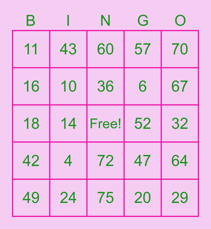 This bingo card has a free space and 24 words: 4, 24, 36, 49, 70, 11, 16, 43, 52, 72, 6, 18, 47, 64, 10, 20, 32, 60, 67, 14, 29, 42, 57 and 75.