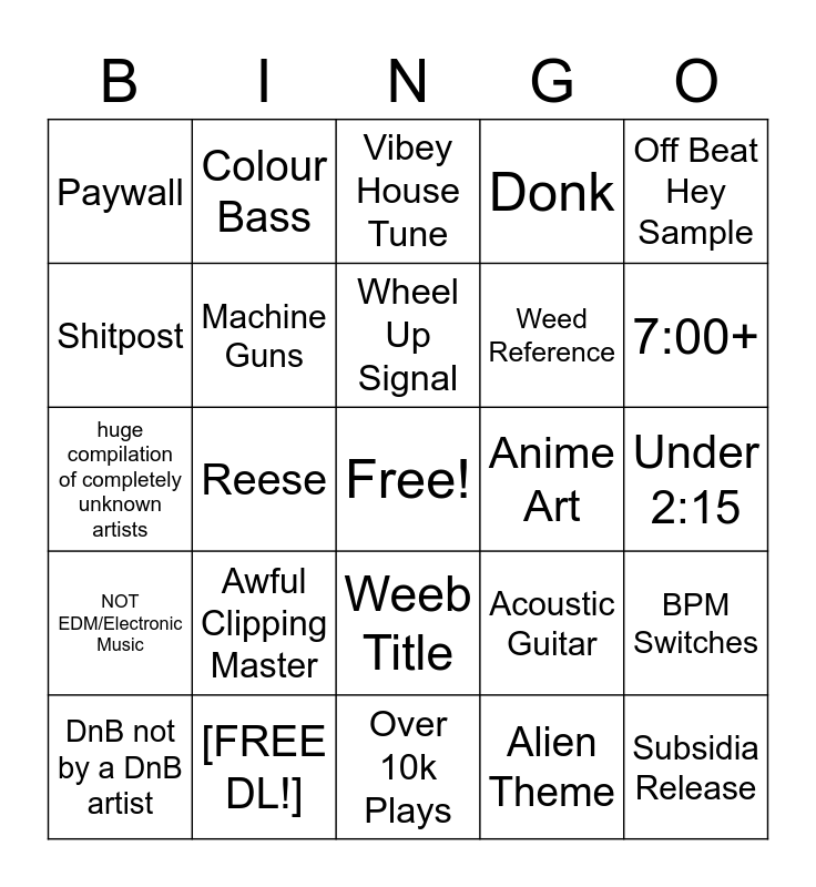 This bingo card has a free space and 38 words: Amen Break, Leotrix Remix/Flip, Generic Riddim [CLIP], Machine Guns, BPM Switches, Awful Clipping Master, Wheel Up Signal, Think Break, Off Beat Hey Sample, Weed Reference, Reese, Donk, Subsidia Release, Under 2:15, Shitpost, NOT EDM/Electronic Music, Dariacore (YUCK!), Vibey House Tune, Showcase, Anime Art, Paywall, [FREE DL!], 7:00+, DnB not by a DnB artist, Under 50 listens, Over 10k Plays, Spanish Speaking, INF1N1TE, Skrillex Related, 200+ BPM, Anime Vocal, Weeb Title, Alien Theme, Colour Bass, Album (WHOA!), Acoustic Guitar, huge compilation of completely unknown artists and Sine Lead and Sync/PWM Lead.