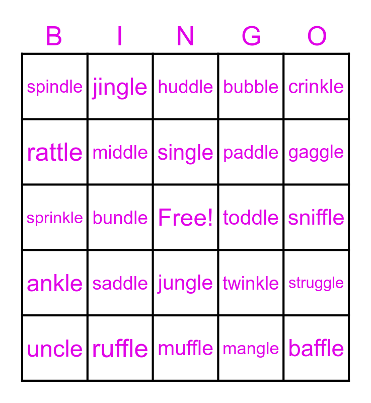 This bingo card has a free space and 29 words: uncle, candle, bundle, handle, spindle, huddle, middle, saddle, toddle, ruffle, sniffle, baffle, muffle, mangle, gaggle, wiggle, jungle, ankle, crinkle, sprinkle, twinkle, bangle, paddle, rattle, bubble, jingle, struggle, single and tangle.
