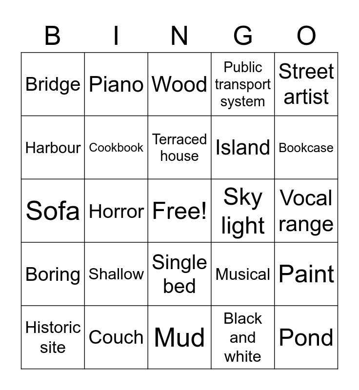 This bingo card has a free space and 32 words: Black and white, Camera, Horror, Animation, Boring, Cookbook, Street artist, Paint, Piano, Flat, Terraced house, Wood, Fridge, Basement, Sky light, Beach, Historic site, Sofa, Single bed, Shallow, Musical, Wardrobe, Vocal range, Couch, Pond, Public transport system, Island, Harbour, Bridge, Mud, open-plan and Bookcase.