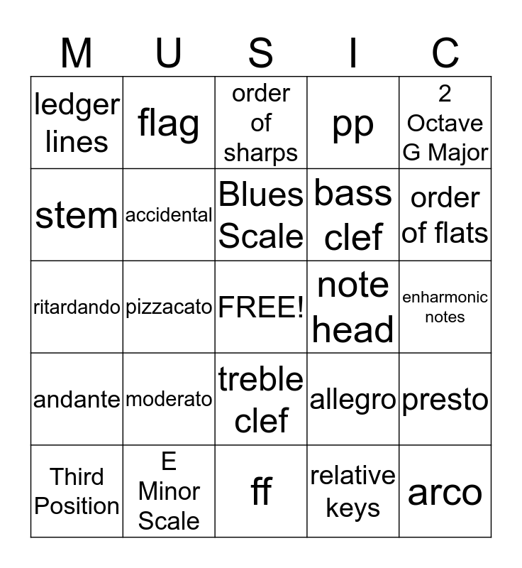 This bingo card has a free space and 24 words: moderato, E Minor Scale, Blues Scale, Third Position, 2 Octave G Major, ledger lines, stem, flag, note head, treble clef, bass clef, ritardando, allegro, presto, accidental, relative keys, enharmonic notes, order of sharps, order of flats, pizzacato, arco, andante, pp and ff.