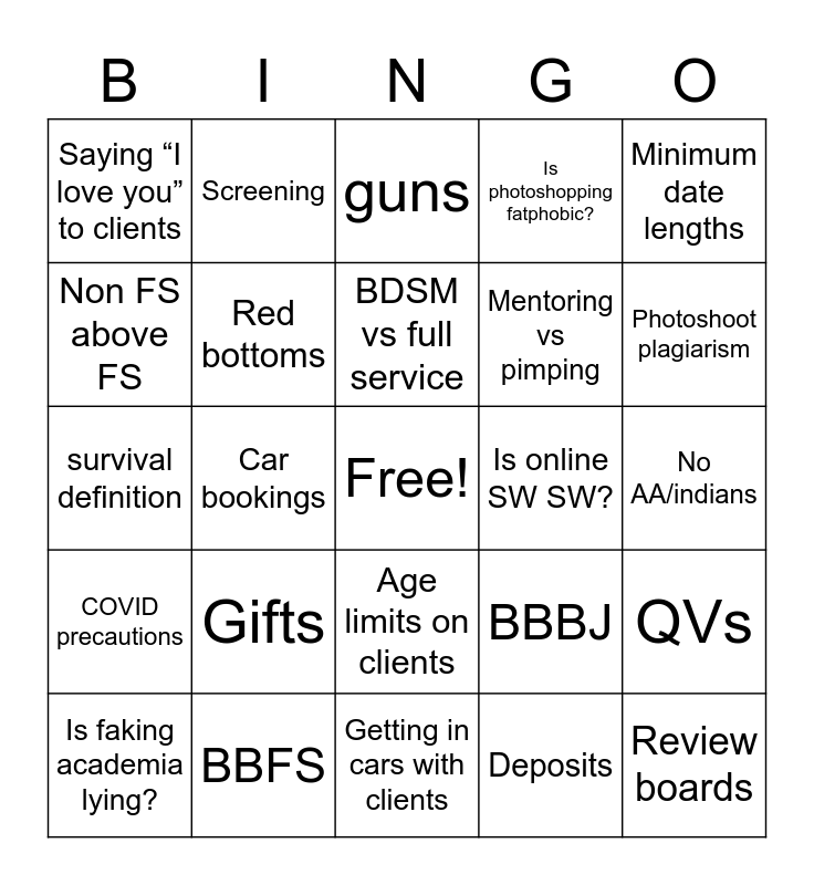 This bingo card has a free space and 24 words: Gifts, BBFS, BDSM vs full service, Is faking academia lying?, Minimum date lengths, Saying “I love you” to clients, Non FS above FS, Screening, Is online SW SW?, Age limits on clients, Mentoring vs pimping, survival definition, BBBJ, QVs, Red bottoms, Deposits, No AA/indians, guns, Photoshoot plagiarism, Car bookings, Review boards, COVID precautions, Is photoshopping fatphobic? and Getting in cars with clients.