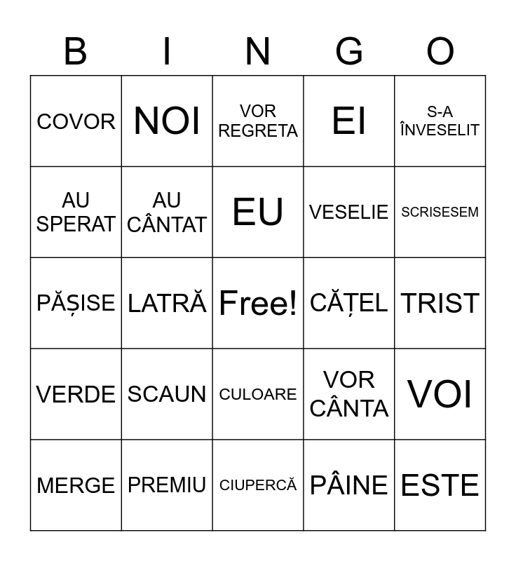 This bingo card has a free space and 29 words: MERGE, VOR VENI, LATRĂ, S-A SPĂLAT, COVOR, VOR REGRETA, AU CÂNTAT, SCAUN, CĂȚEL, PREMIU, TRIST, ESTE, CIUPERCĂ, PÂINE, SCRISESEM, COLORAT, CULOARE, VERDE, S-A ÎNVESELIT, PĂȘISE, VOR CÂNTA, ALERGĂM, VESELIE, AU SPERAT, EI, NOI, VOI, EU and TU.