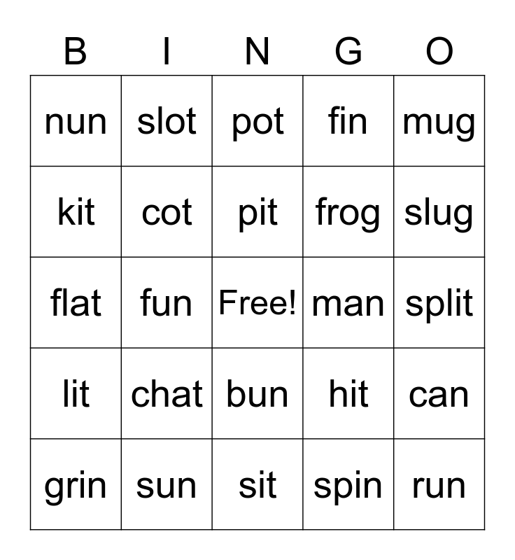 This bingo card has a free space and 24 words: chat, sun, pit, grin, mug, nun, kit, slot, man, bun, frog, flat, hit, can, cot, spin, split, pot, slug, fun, run, lit, fin and sit.