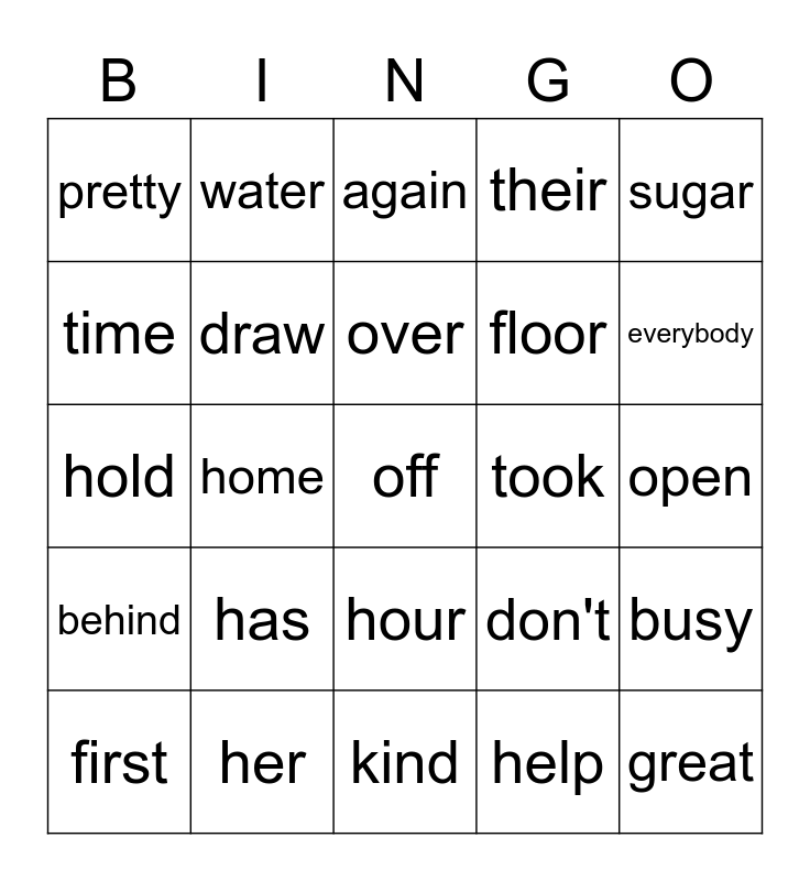 This bingo card has 25 words: has, kind, over, first, sugar, pretty, time, water, took, hour, floor, hold, don't, busy, draw, great, open, again, everybody, home, off, her, behind, their and help.