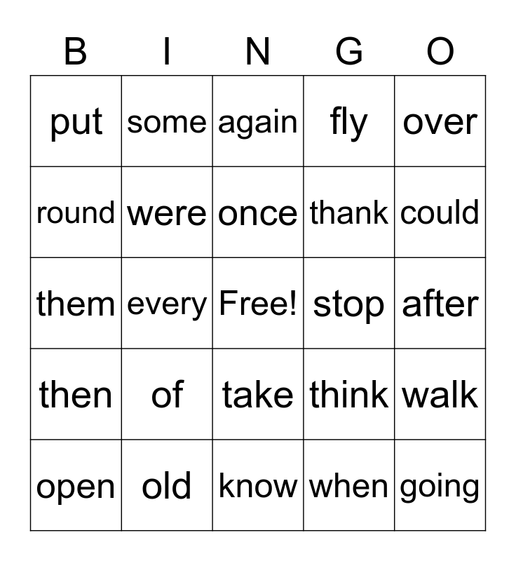 This bingo card has a free space and 24 words: of, old, once, open, over, put, round, some, stop, take, thank, them, think, walk, were, when, after, again, could, every, going, then, fly and know.