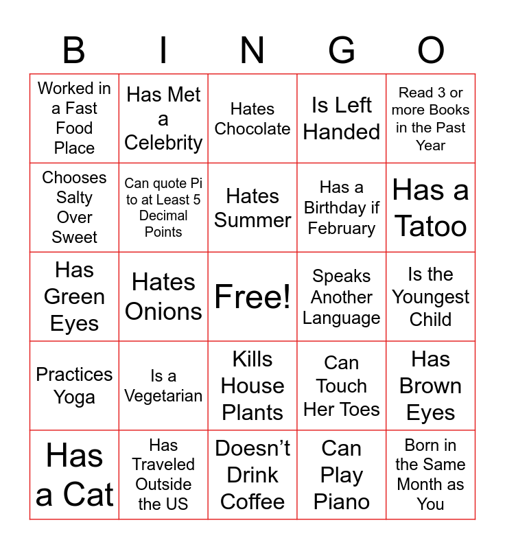 This bingo card has a free space and 43 words: Wears Contacts, Born in the Same Month as You, Has a Dog, Has a Cat, Can Play Guitar, Can Play Piano, Hates Chocolate, Saw a Live Concert in the Last Year, Read 3 or more Books in the Past Year, Has Traveled Outside the US, Is Left Handed, Speaks Another Language, Kills House Plants, Is a Vegetarian, Wears Socks to Bed, Doesn’t Drink Coffee, Is Allergic to Cats, Has Green Eyes, Knows How to Sew, Has a Tatoo, Has Met a Celebrity, Is not on Facebook, Has Been on a Train, Worked in a Fast Food Place, Has More than 3 Children, Is the Youngest Child, Is Afraid of Spiders, Can Run 2 Miles, Can Touch Her Toes, Practices Yoga, Has Blue Eyes, Has Brown Eyes, Hates Mushrooms, Hates Onions, Loves Roller Coasters, Has or Has Had a Pet Bird, Loves Winter, Hates Summer, Chooses Salty Over Sweet, Has a Birthday if February, Has 3 or More Siblings, Can quote Pi to at Least 5 Decimal Points and Likes to Knit or Crochet.