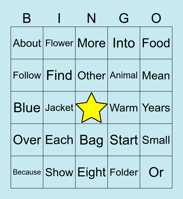 This bingo card has 1 images, a free space and 24 words: Because, Each, Other, Folder, Mean, About, Flower, More, Animal, Small, Blue, Find, Start, Or, Follow, Show, Eight, Into, Years, Over, Jacket, Bag, Warm and Food.