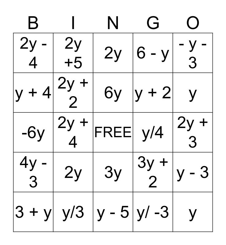 This bingo card has a free space and 24 words: 2y, y/3, 6y, 3 + y, - y - 3, 2y - 4, y + 4, 2y +5, y/4, 3y, y + 2, -6y, 3y + 2, y - 3, 2y + 2, y/ -3, 2y + 3, 2y, y, 2y + 4, y, 4y - 3, 6 - y and y - 5.