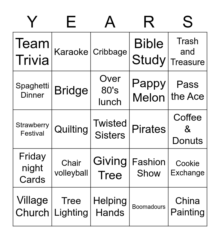 This bingo card has 25 words: Chair volleyball, Helping Hands, Over 80's lunch, Village Church, Trash and Treasure, Team Trivia, Spaghetti Dinner, Karaoke, Pirates, Giving Tree, Pappy Melon, Strawberry Festival, Fashion Show, Cookie Exchange, Bridge, China Painting, Coffee & Donuts, Cribbage, Pass the Ace, Quilting, Twisted Sisters, Tree Lighting, Friday night Cards, Bible Study and Boomadours.