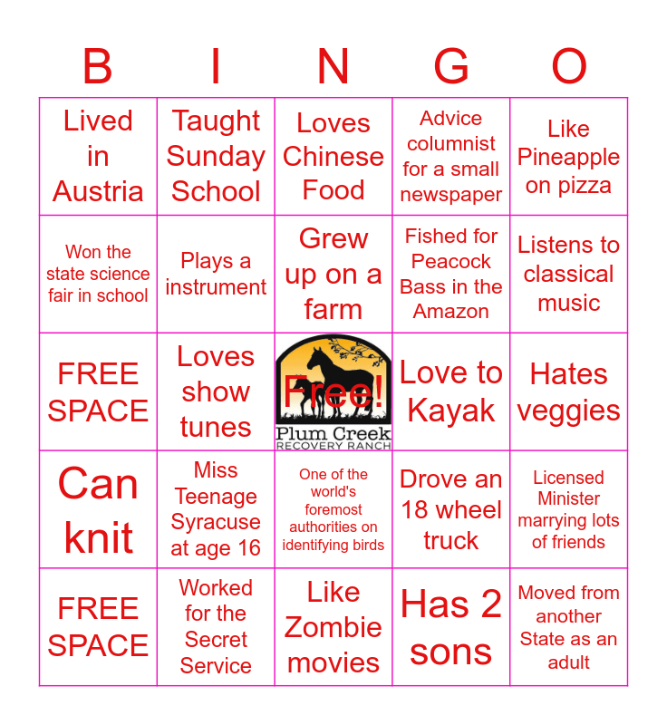 This bingo card has a free space and 24 words: Miss Teenage Syracuse at age 16, Worked for the Secret Service, Grew up on a farm, FREE SPACE, Like Pineapple on pizza, Lived in Austria, Won the state science fair in school, Taught Sunday School, Love to Kayak, One of the world's foremost authorities on identifying birds, Fished for Peacock Bass in the Amazon, FREE SPACE, Drove an 18 wheel truck, Licensed Minister marrying lots of friends, Plays a instrument, Has 2 sons, Hates veggies, Loves Chinese Food, Listens to classical music, Loves show tunes, Moved from another State as an adult, Can knit, Advice columnist for a small newspaper and Like Zombie movies.