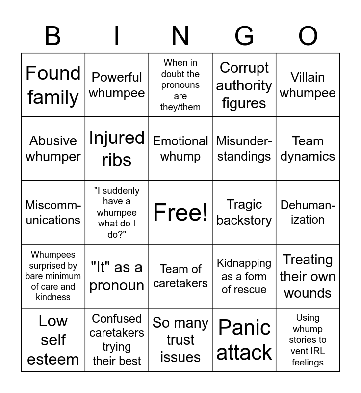 This bingo card has a free space and 24 words: "It" as a pronoun, Confused caretakers trying their best, Emotional whump, Low self esteem, Villain whumpee, Found family, Abusive whumper, Powerful whumpee, Tragic backstory, Team of caretakers, Misunder-standings, Miscomm-unications, Kidnapping as a form of rescue, Treating their own wounds, Injured ribs, Panic attack, Dehuman-ization, When in doubt the pronouns are they/them, Team dynamics, "I suddenly have a whumpee what do I do?", Using whump stories to vent IRL feelings, Whumpees surprised by bare minimum of care and kindness, Corrupt authority figures and So many trust issues.