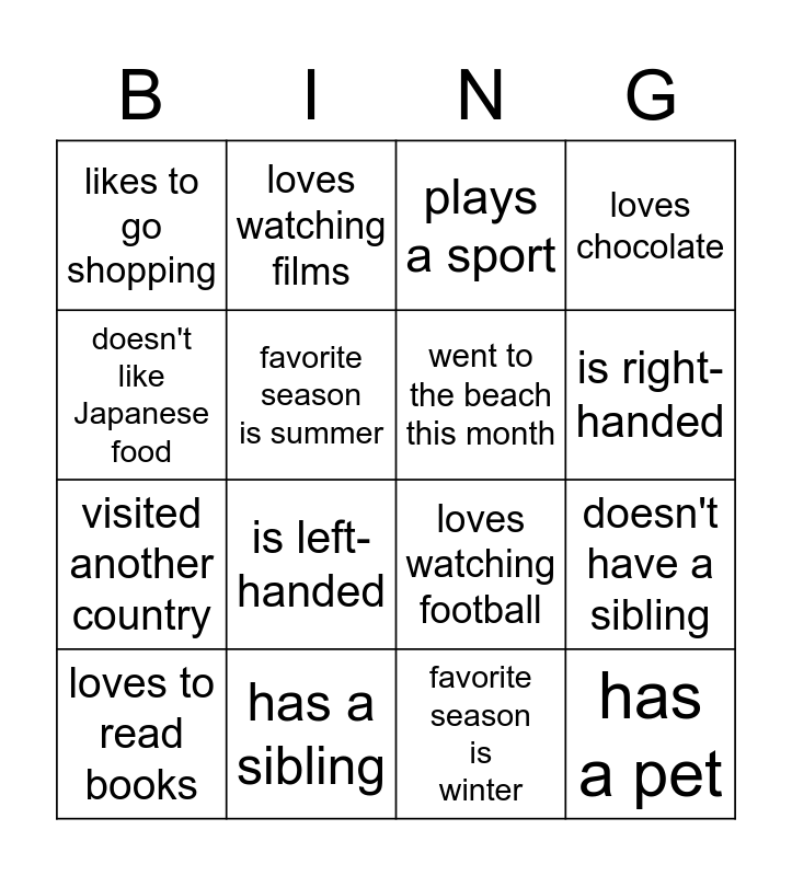 This bingo card has 16 words: has a sibling, doesn't have a sibling, plays a sport, likes to go shopping, visited another country, loves watching films, loves watching football, favorite season is winter, doesn't like Japanese food, favorite season is summer, loves to read books, loves chocolate, is left-handed, is right-handed, went to the beach this month and has a pet.
