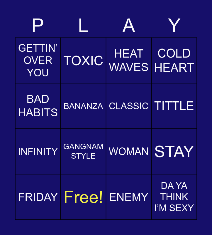 This bingo card has 16 words: Free!, STAY, HEAT WAVES, GETTIN’ OVER YOU, INFINITY, TOXIC, WOMAN, ENEMY, BAD HABITS, BANANZA, FRIDAY, COLD HEART, GANGNAM STYLE, TITTLE, CLASSIC and DA YA THINK I’M SEXY.