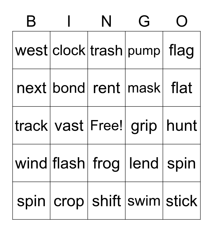 This bingo card has a free space and 24 words: flash, crop, rent, spin, flag, west, next, clock, grip, frog, mask, track, lend, spin, bond, swim, hunt, trash, flat, vast, stick, wind, pump and shift.