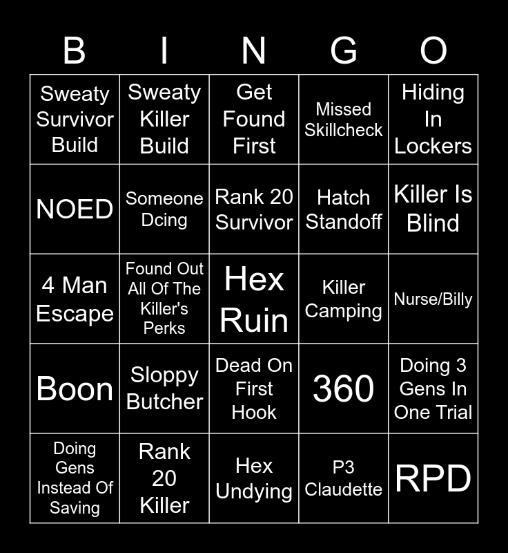 This bingo card has a free space and 24 words: Sloppy Butcher, Rank 20 Killer, Rank 20 Survivor, Doing Gens Instead Of Saving, Hiding In Lockers, Sweaty Survivor Build, NOED, Sweaty Killer Build, Killer Camping, Dead On First Hook, Hatch Standoff, 4 Man Escape, 360, Doing 3 Gens In One Trial, Someone Dcing, P3 Claudette, Nurse/Billy, Get Found First, Killer Is Blind, Found Out All Of The Killer's Perks, RPD, Boon, Missed Skillcheck and Hex Undying.