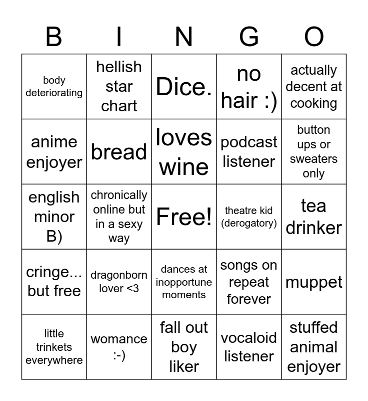 This bingo card has a free space and 24 words: dragonborn lover <3, womance :-), loves wine, little trinkets everywhere, actually decent at cooking, body deteriorating, anime enjoyer, hellish star chart, theatre kid (derogatory), dances at inopportune moments, podcast listener, english minor B), songs on repeat forever, muppet, bread, vocaloid listener, tea drinker, Dice., button ups or sweaters only, chronically online but in a sexy way, stuffed animal enjoyer, cringe... but free, no hair :) and fall out boy liker.