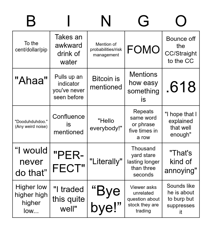 This bingo card has a free space and 24 words: "PER-FECT", "I traded this quite well", Bitcoin is mentioned, Higher low higher high higher low..., Bounce off the CC/Straight to the CC, To the cent/dollar/pip, "Ahaa", Takes an awkward drink of water, Repeats same word or phrase five times in a row, "Literally", Mentions how easy something is, "Dooduhduhdoo." (Any weird noise), Thousand yard stare lasting longer than three seconds, "That's kind of annoying", Pulls up an indicator you've never seen before, Viewer asks unrelated question about stock they are trading, "I hope that I explained that well enough", Mention of probabilities/risk management, .618, Confluence is mentioned, Sounds like he is about to burp but suppresses it, “I would never do that”, FOMO and “Bye bye!”.