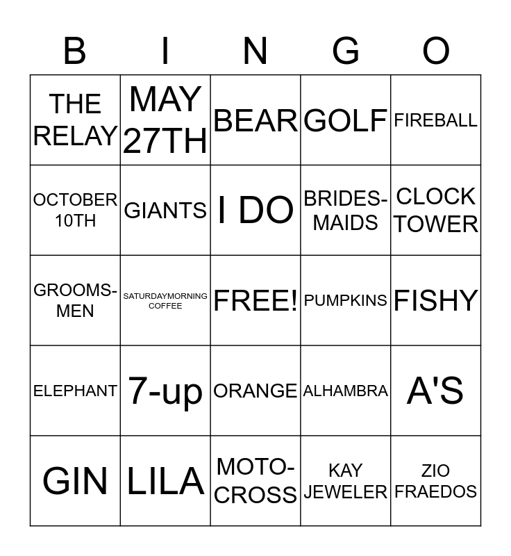 This bingo card has a free space and 24 words: 7-up, LILA, I DO, GIN, FIREBALL, THE RELAY, OCTOBER 10TH, MAY 27TH, PUMPKINS, ORANGE, BRIDES- MAIDS, GROOMS-MEN, ALHAMBRA, A'S, GIANTS, KAY JEWELER, FISHY, BEAR, CLOCK TOWER, SATURDAYMORNING COFFEE, ZIO FRAEDOS, ELEPHANT, GOLF and MOTO-CROSS.