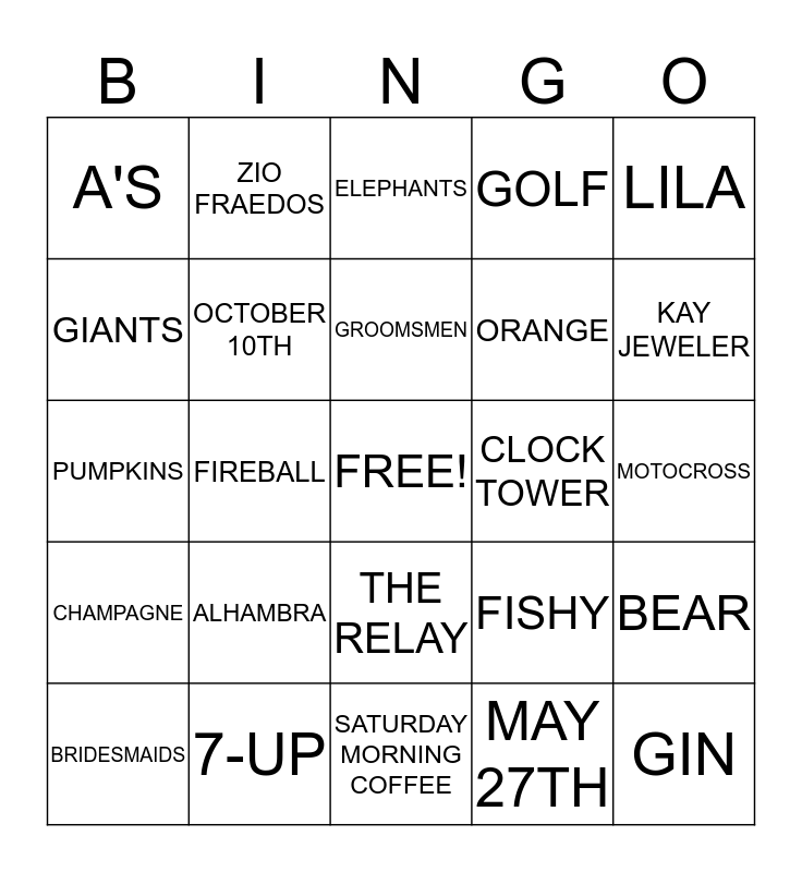 This bingo card has a free space and 24 words: ALHAMBRA, 7-UP, GROOMSMEN, BRIDESMAIDS, LILA, A'S, GIANTS, ZIO FRAEDOS, CLOCK TOWER, THE RELAY, ORANGE, PUMPKINS, FISHY, BEAR, OCTOBER 10TH, MAY 27TH, MOTOCROSS, ELEPHANTS, KAY JEWELER, FIREBALL, GIN, CHAMPAGNE, GOLF and SATURDAY MORNING COFFEE.