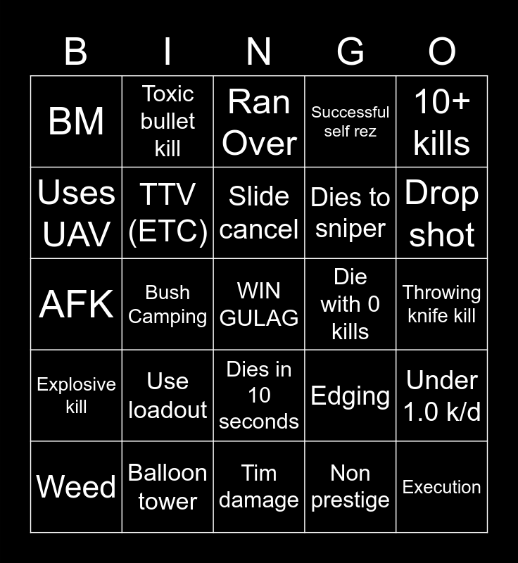 This bingo card has a free space and 24 words: Use loadout, Balloon tower, Slide cancel, Weed, 10+ kills, BM, Uses UAV, Toxic bullet kill, Die with 0 kills, Dies in 10 seconds, Dies to sniper, AFK, Edging, Under 1.0 k/d, TTV (ETC), Non prestige, Throwing knife kill, Ran Over, Drop shot, Bush Camping, Execution, Explosive kill, Successful self rez and Tim damage.
