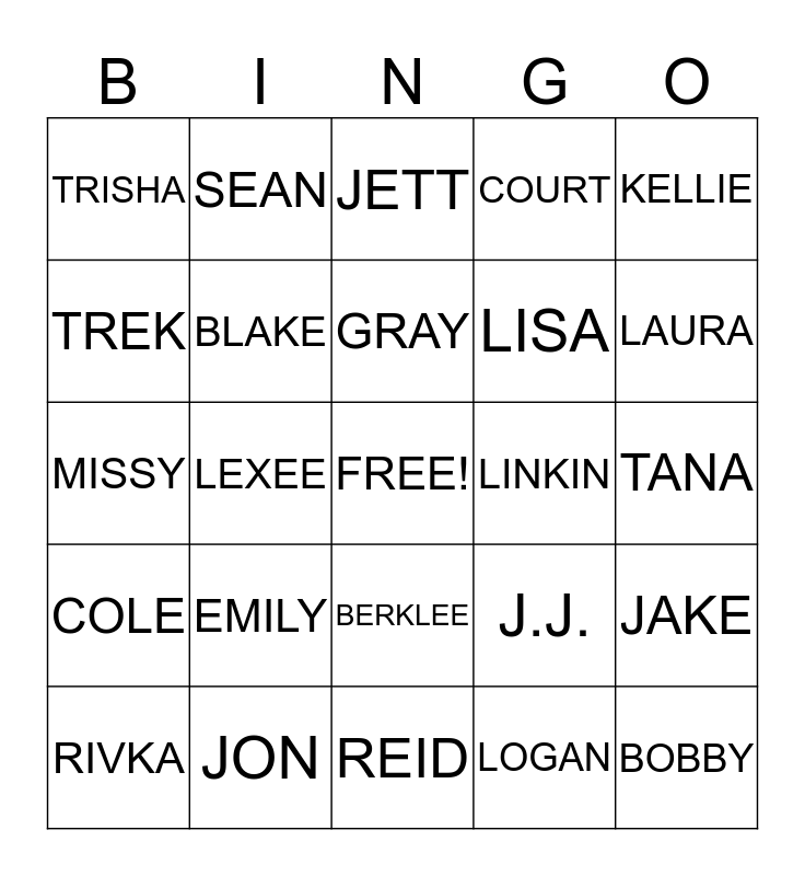 This bingo card has a free space and 72 words: RACHAEL, SEAN, LEXEE, TODD, B.J., MADISON, COURT, JED, LISA, ANDY, RIVKA, DOUG, LAURA, TRISHA, KIM, MISSY, J.J., KELLIE, JARED, TANA, EMILY, BOBBY, JAKE, MIKELLE, ASHLEE, VAL, ERIN, PAUL, ALESA, JENELLE, JON, KATIE, NATE, DANA, LOGAN, TAYLOR, PARKS, BEHR, TREK, SAYLER, BERKLEE, KASH, ZANDER, JORDYN, NOAH, COLE, BRYSON, CREW, TYREE, TURRELL, MALIYAH, KENDRIE, CHANCIE, LINKIN, JAXON, GRAYSON, JETT, GRAY, KAIGE, LUNDYNN, TORI, SHELBY, BROOKS, REID, BRYNLEE, STOCKTON, BLAKE, MARLEY, HARPER, CARTER, LUKE and BEN.