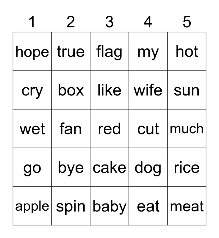 This bingo card has 30 words: apple, it, like, egg, hot, hope, true, cake, cut, meat, go, box, use, eat, rice, pig, fan, red, dog, sun, wet, spin, flag, wife, much, cry, bye, baby, my and city.