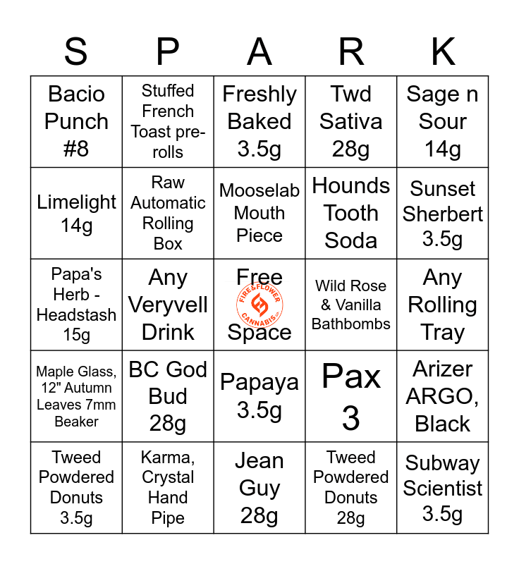 This bingo card has a free space and 24 words: BC God Bud 28g, Karma, Crystal Hand Pipe, Mooselab Mouth Piece, Tweed Powdered Donuts 3.5g, Sage n Sour 14g, Bacio Punch #8, Limelight 14g, Stuffed French Toast pre-rolls, Wild Rose & Vanilla Bathbombs, Papaya 3.5g, Hounds Tooth Soda, Papa's Herb -Headstash 15g, Pax 3, Arizer ARGO, Black, Raw Automatic Rolling Box, Tweed Powdered Donuts 28g, Any Rolling Tray, Freshly Baked 3.5g, Sunset Sherbert 3.5g, Any Veryvell Drink, Subway Scientist 3.5g, Maple Glass, 12" Autumn Leaves 7mm Beaker, Twd Sativa 28g and Jean Guy 28g.