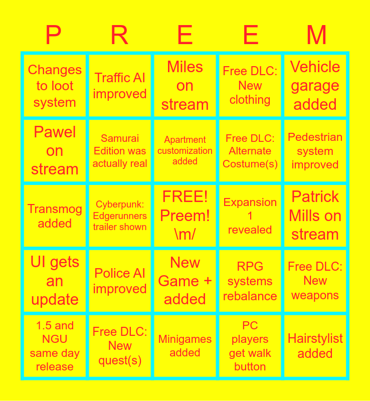 This bingo card has a free space and 24 words: Police AI improved, Free DLC: New quest(s), Apartment customization added, 1.5 and NGU same day release, Vehicle garage added, Changes to loot system, Pawel on stream, Traffic AI improved, Expansion 1 revealed, New Game + added, Free DLC: Alternate Costume(s), Transmog added, RPG systems rebalance, Free DLC: New weapons, Samurai Edition was actually real, PC players get walk button, Patrick Mills on stream, Miles on stream, Pedestrian system improved, Cyberpunk: Edgerunners trailer shown, Hairstylist added, UI gets an update, Free DLC: New clothing and Minigames added.