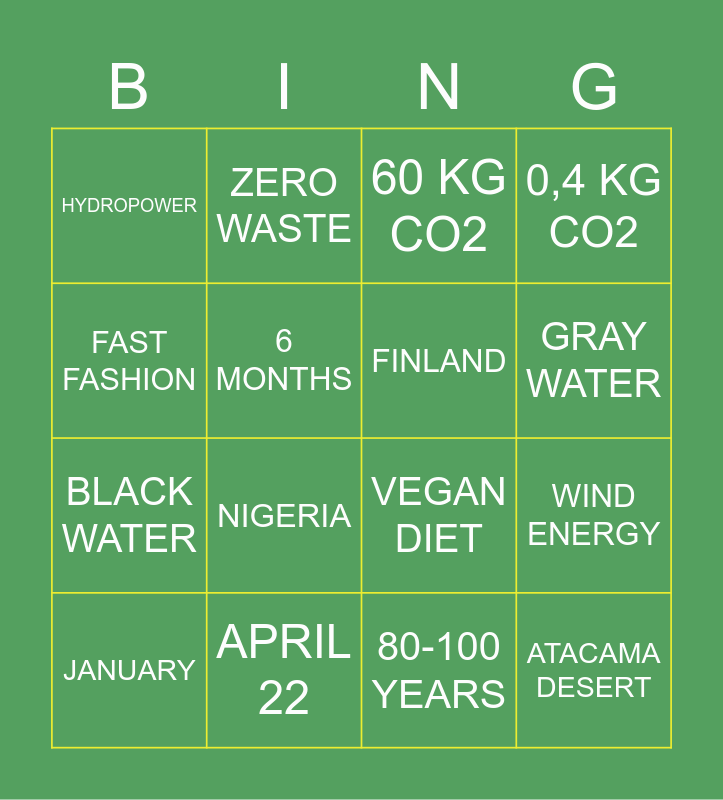 This bingo card has 16 words: JANUARY, APRIL 22, 60 KG CO2, 0,4 KG CO2, FAST FASHION, ZERO WASTE, VEGAN DIET, WIND ENERGY, HYDROPOWER, 6 MONTHS, 80-100 YEARS, GRAY WATER, BLACK WATER, NIGERIA, FINLAND and ATACAMA DESERT.