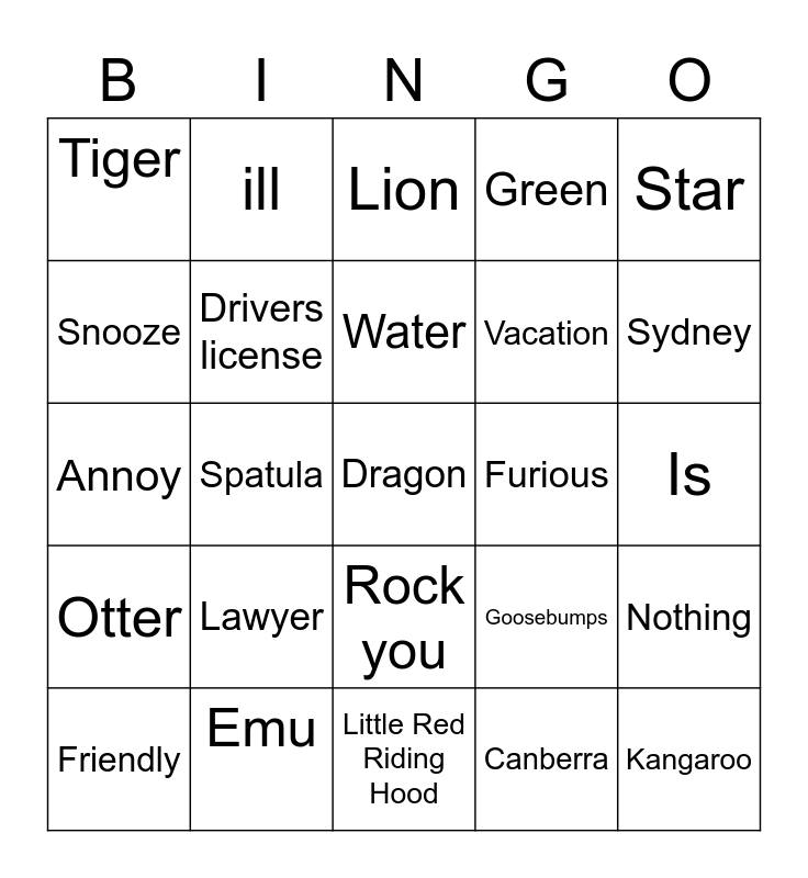 This bingo card has a free space and 29 words: Friendly, Unlikely, Spatula, Lug wrench, Tiger, Lion, Drivers license, Lawyer, Furious, Emu, Is, Kangaroo, Little Red Riding Hood, Canberra, Sydney, Exhausted, Rock you, Otter, Star, Annoy, Goosebumps, Semester, Vacation, Snooze, Green, ill, Nothing, Water and Birch.