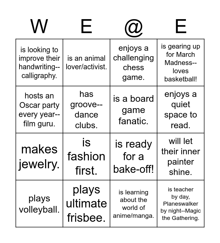 This bingo card has 16 words: plays ultimate frisbee., will let their inner painter shine., enjoys a challenging chess game., is looking to improve their handwriting--calligraphy., makes jewelry., is an animal lover/activist., is ready for a bake-off!, is learning about the world of anime/manga., hosts an Oscar party every year--film guru., has groove--dance clubs., plays volleyball., is gearing up for March Madness--loves basketball!, is fashion first., enjoys a quiet space to read., is a board game fanatic. and is teacher by day, Planeswalker by night--Magic the Gathering..