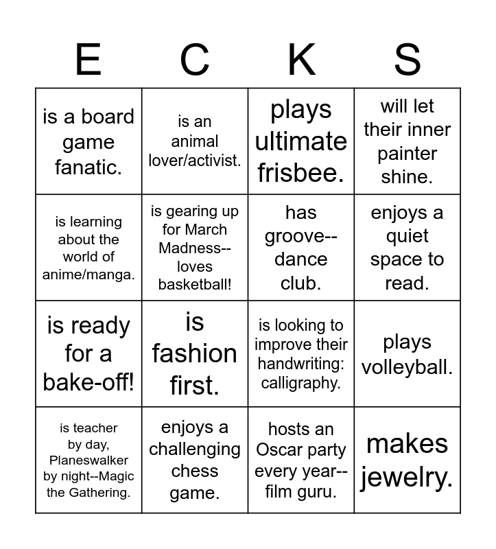 This bingo card has 16 words: enjoys a challenging chess game., plays volleyball., plays ultimate frisbee., is a board game fanatic., is ready for a bake-off!, is an animal lover/activist., is looking to improve their handwriting: calligraphy., hosts an Oscar party every year--film guru., is learning about the world of anime/manga., is gearing up for March Madness--loves basketball!, is teacher by day, Planeswalker by night--Magic the Gathering., will let their inner painter shine., is fashion first., enjoys a quiet space to read., has groove--dance club. and makes jewelry..