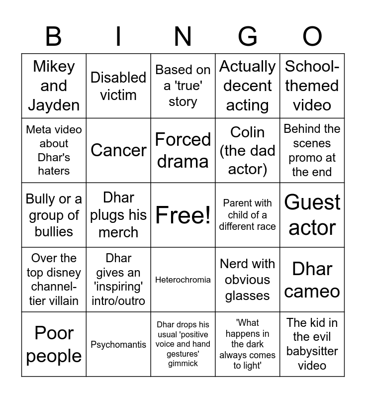 This bingo card has a free space and 24 words: Dhar gives an 'inspiring' intro/outro, Psychomantis, Forced drama, Poor people, School-themed video, Mikey and Jayden, Meta video about Dhar's haters, Disabled victim, Parent with child of a different race, Heterochromia, Colin (the dad actor), Bully or a group of bullies, Nerd with obvious glasses, Dhar cameo, Cancer, 'What happens in the dark always comes to light', Guest actor, Based on a 'true' story, Behind the scenes promo at the end, Dhar plugs his merch, The kid in the evil babysitter video, Over the top disney channel-tier villain, Actually decent acting and Dhar drops his usual 'positive voice and hand gestures' gimmick.