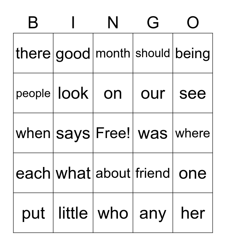 This bingo card has a free space and 24 words: what, little, on, put, being, there, people, good, was, about, our, when, friend, one, look, any, where, month, see, says, her, each, should and who.