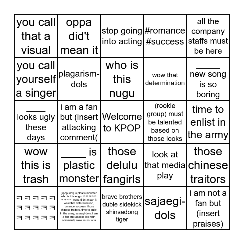 This bingo card has a free space and 24 words: ____ is plastic monster, (kpop idol) is plastic monster, who is this nugu, ㅋㅋㅋㅋㅋㅋㅋㅋㅋ, oppa didnt mean it, wow that determination, romance success, those chinese traitors, time to enlist in the army, sajaegi-dols, i am a fan but (attacks idol with comment), wow im not a fa, who is this nugu, ㅋㅋㅋㅋㅋㅋㅋㅋㅋㅋㅋㅋㅋㅋㅋ, all the company staffs must be here, you call that a visual, you call yourself a singer, oppa did't mean it, (rookie group) must be talented based on those looks, those delulu fangirls, wow that determination, ____ looks ugly these days, look at that media play, those chinese traitors, plagarism-dols, sajaegi-dols, time to enlist in the army, stop going into acting, _____ new song is so boring, i am a fan but (insert attacking comment(, i am not a fan but (insert praises), wow this is trash, #romance #success and brave brothers duble sidekick shinsadong tiger.