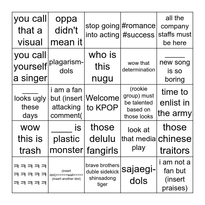 This bingo card has a free space and 24 words: ____ is plastic monster, (insert idol)>>>>>>wall>>>>> (insert another idol), who is this nugu, ㅋㅋㅋㅋㅋㅋㅋㅋㅋㅋㅋㅋㅋㅋㅋ, all the company staffs must be here, you call that a visual, you call yourself a singer, oppa didn't mean it, (rookie group) must be talented based on those looks, those delulu fangirls, wow that determination, ____ looks ugly these days, look at that media play, those chinese traitors, plagarism-dols, sajaegi-dols, time to enlist in the army, stop going into acting, _____ new song is so boring, i am a fan but (insert attacking comment(, i am not a fan but (insert praises), wow this is trash, #romance #success and brave brothers duble sidekick shinsadong tiger.