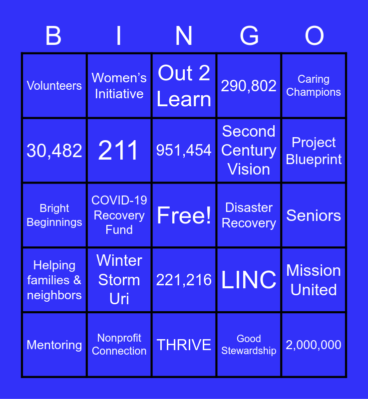 This bingo card has a free space and 35 words: 1,400,000, 12,990, 18,000,000, 211, 221,216, 290,802, 30,482, 47%, 951,454, ALICE, Bright Beginnings, Caring Champions, Centers, Day of Caring, Volunteers, Disaster Recovery, Good Stewardship, COVID-19 Recovery Fund, Helping families & neighbors, 2,000,000, LINC, Mentoring, Mission United, Nonprofit Connection, Out 2 Learn, Project Blueprint, Project Undercover, Rebuilding Lives, Second Century Vision, Seniors, MATH in a Flash, THRIVE, Winter Storm Uri, Women’s Initiative and Youth Success.