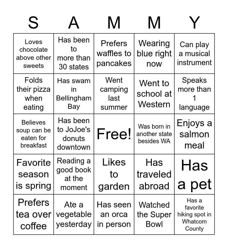 This bingo card has a free space and 24 words: Reading a good book at the moment, Ate a vegetable yesterday, Went camping last summer, Prefers tea over coffee, Can play a musical instrument, Loves chocolate above other sweets, Folds their pizza when eating, Has been to more than 30 states, Was born in another state besides WA, Likes to garden, Went to school at Western, Believes soup can be eaten for breakfast, Has traveled abroad, Has a pet, Has swam in Bellingham Bay, Watched the Super Bowl, Enjoys a salmon meal, Prefers waffles to pancakes, Speaks more than 1 language, Has been to JoJoe's donuts downtown, Has a favorite hiking spot in Whatcom County, Favorite season is spring, Wearing blue right now and Has seen an orca in person.