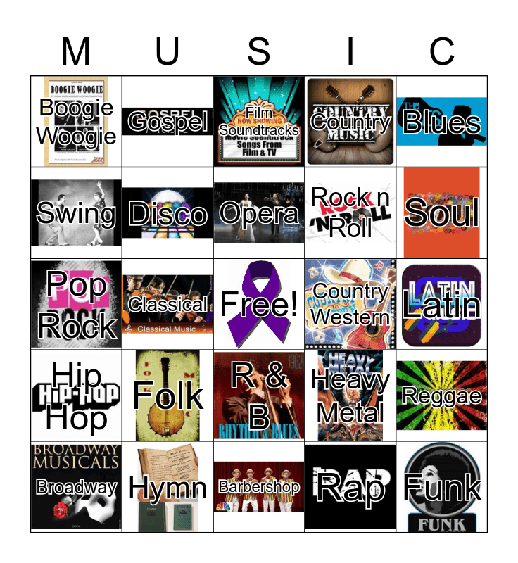 This bingo card has 24 images, a free space and 24 words: Folk, Hymn, Opera, Broadway, Blues, Boogie Woogie, Swing, Gospel, Country Western, R & B, Rock n Roll, Pop Rock, Heavy Metal, Reggae, Disco, Rap, Latin, Film Soundtracks, Soul, Classical, Funk, Hip Hop, Country and Barbershop.